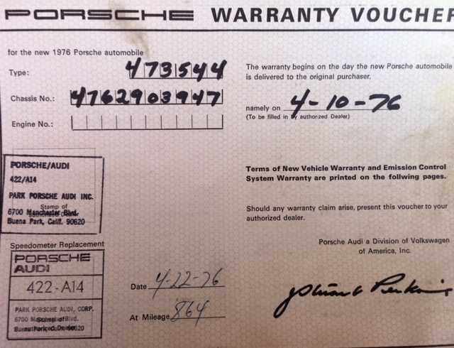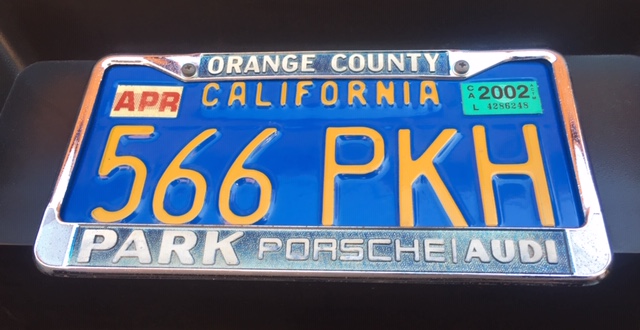 On the lighter side, I was recently able to acquire a dealer license plate frame originally from Park Porsche/AUDI, in Buena Park, CA, where my car was first sold in April, 1976. They've been out of business for many years.