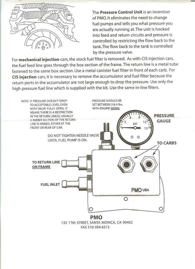 As to the regulator - there are only 2 ways to successfully run fuel to carbs. Using an internally regulated fuel pump, or using a fuel regulator. The regulated pumps are non-adjustable and you buy the one that has the right pressure (under 5 PSI). Regulators come in bypass or non-bypass versions. The stock regulator has a bypass, and the excess fuel goes back to the tank. Many carb regulators don't have a bypass, and are designed with only one line to be used (no return). This does require a low pressure fuel pump too - you can't use the stock pump regulated or not.