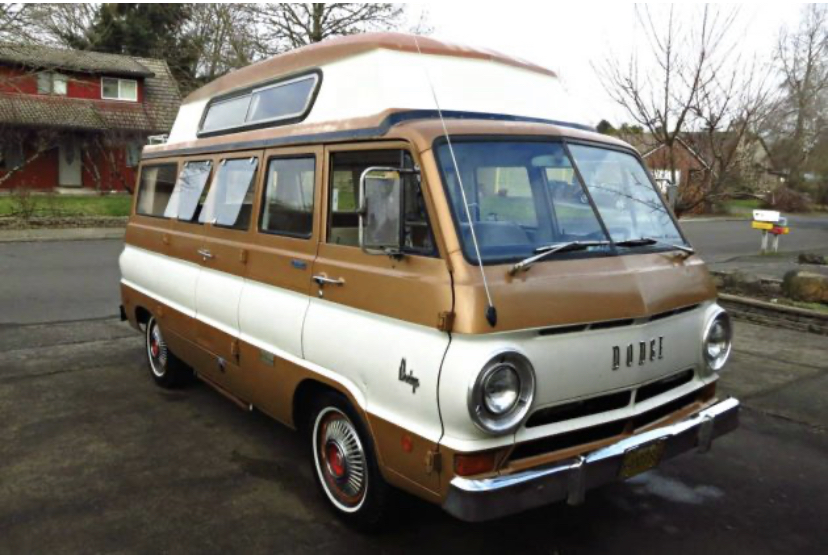 Dodge A100 van with some sort of roof extension on it so he could stand up inside it. Small cabinets, tiny kitchen. Sort of like this one.