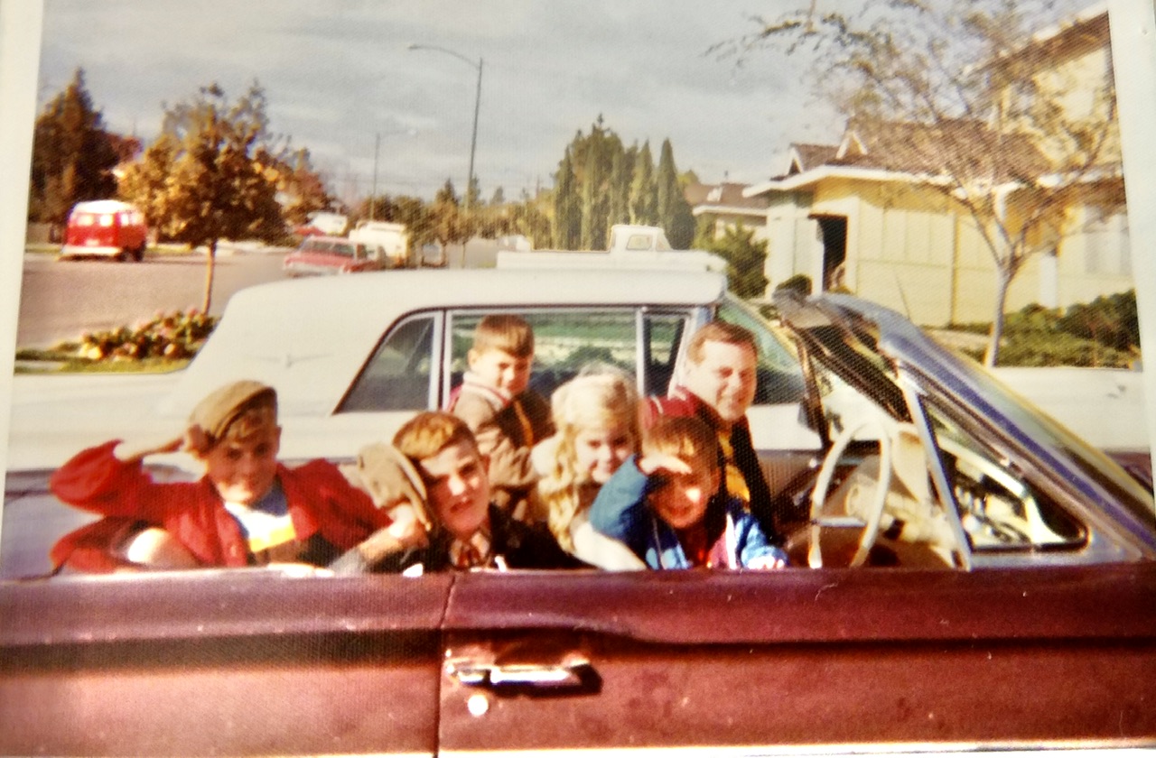6 kids...(I am the youngest) with the little kids in the back, facing backwards...window open...dog hanging out the back.