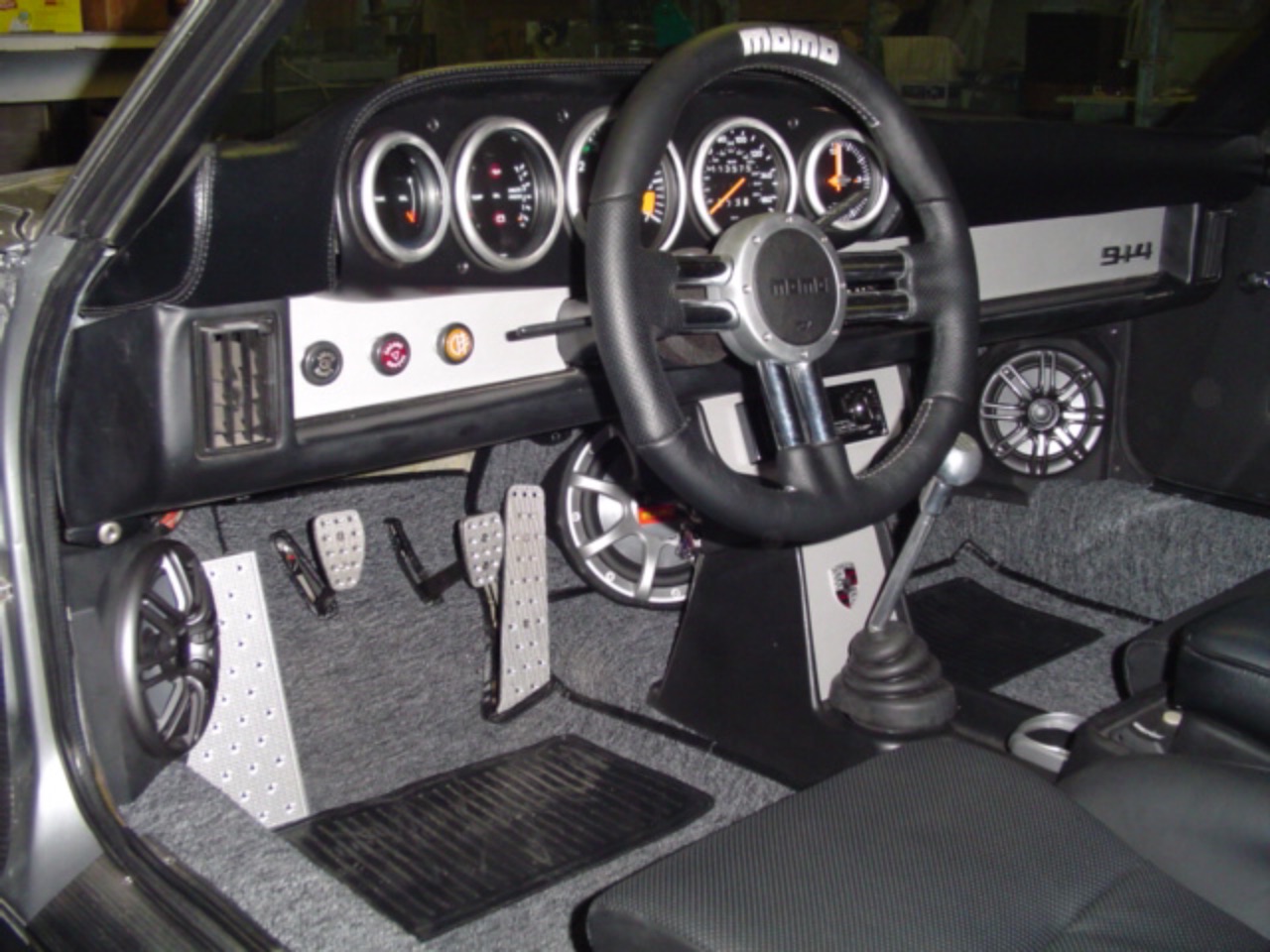 custom fitted 10 "subwoofers, on floor, in front of seat, sat at an angle.