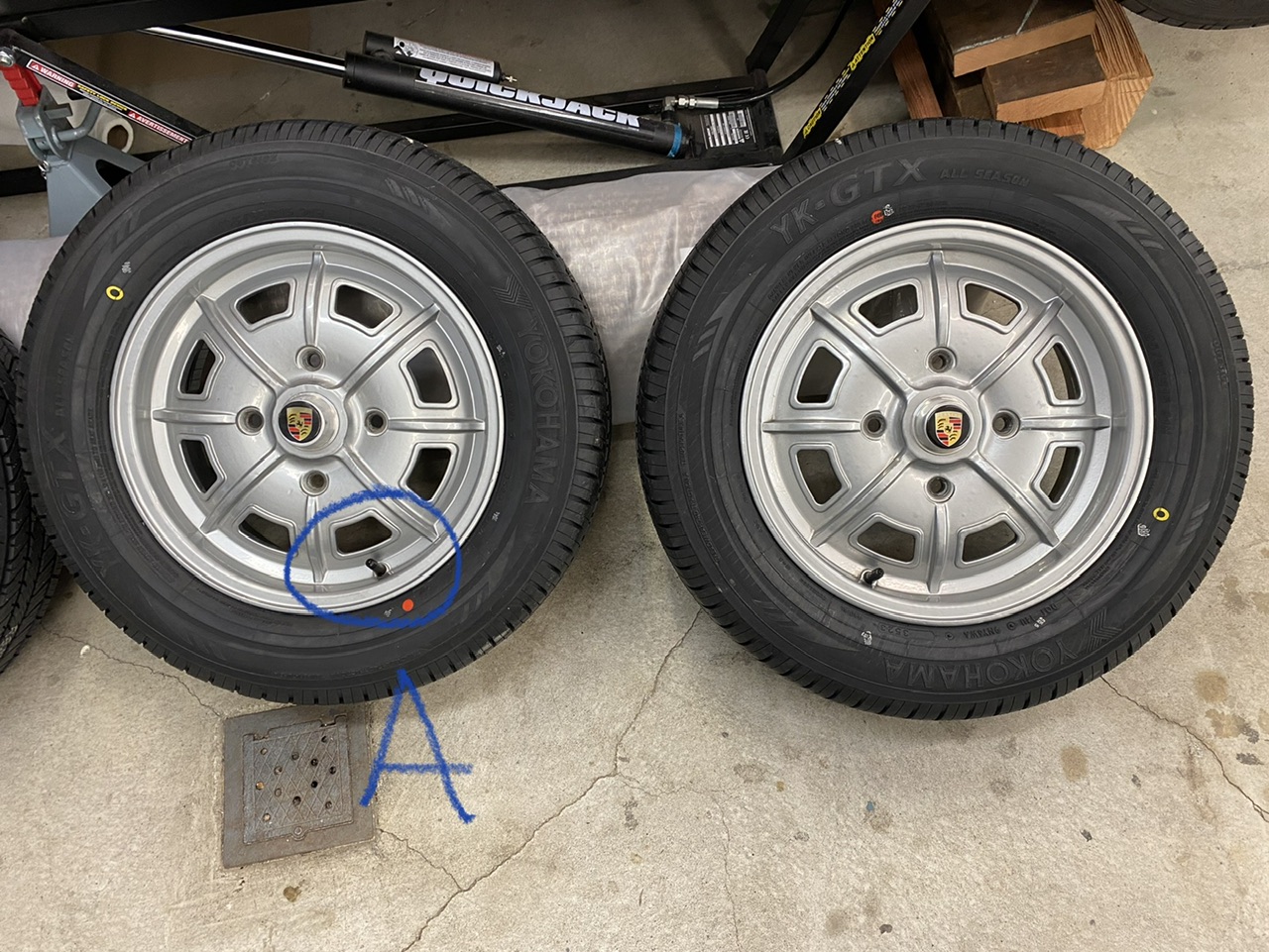 Just had my new tires mounted and I was putting on the center caps. Wanted to align the Porsche crest the same on all rims but then there was the freak rim! See “A”. The valve stem home location doesn’t match the other rims in comparison to the spokes.