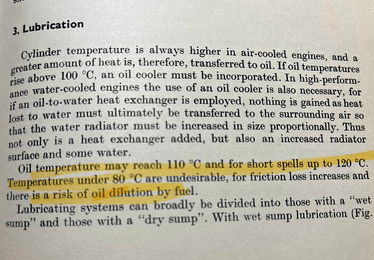 Lest anyone accuse me of just propagating my own mythology here is an excerpt from an engineering text on air cooled engine. Note: this book was first published in 1961 and second edition in 1972 . . . So again Dino oil era.