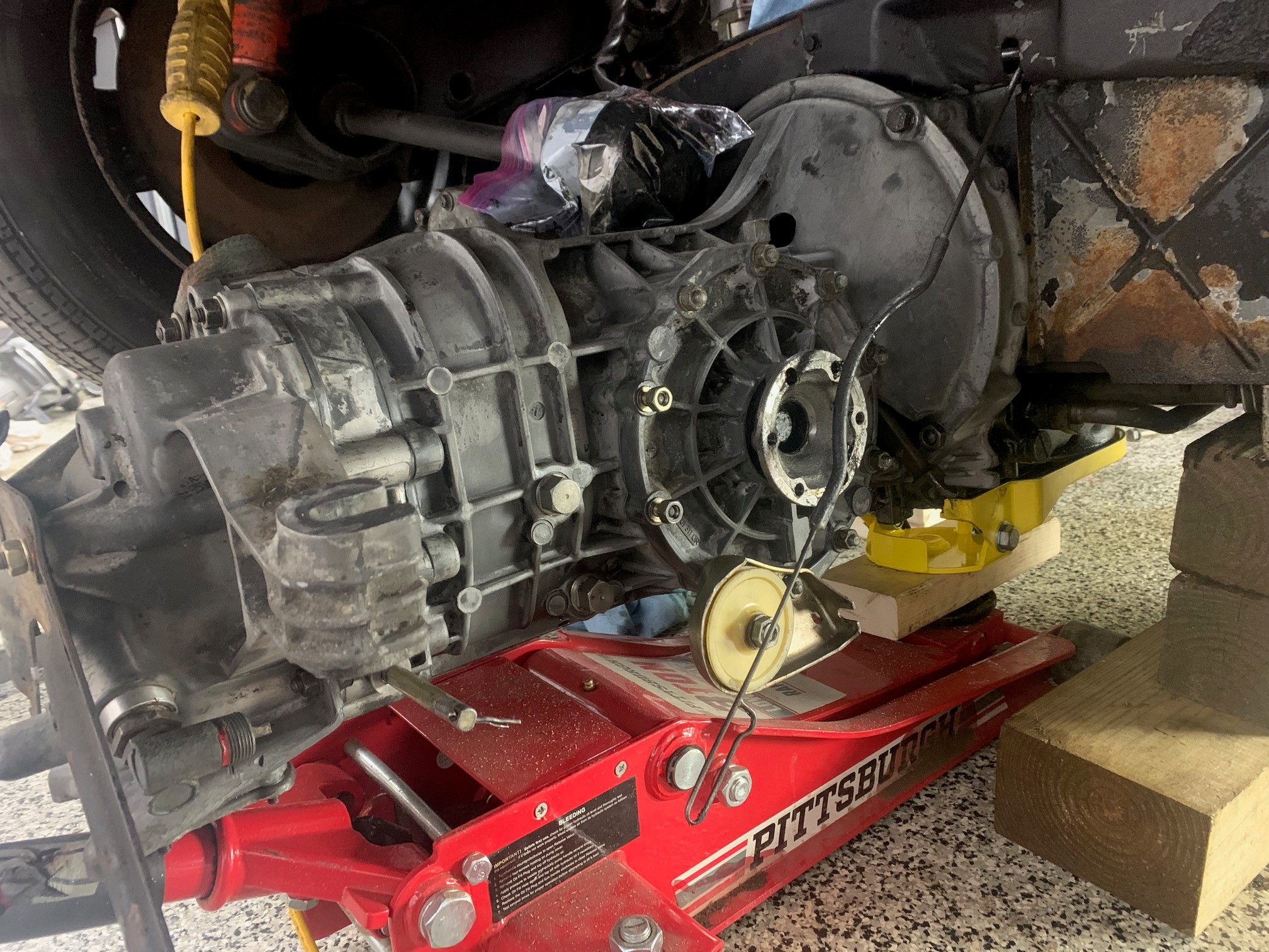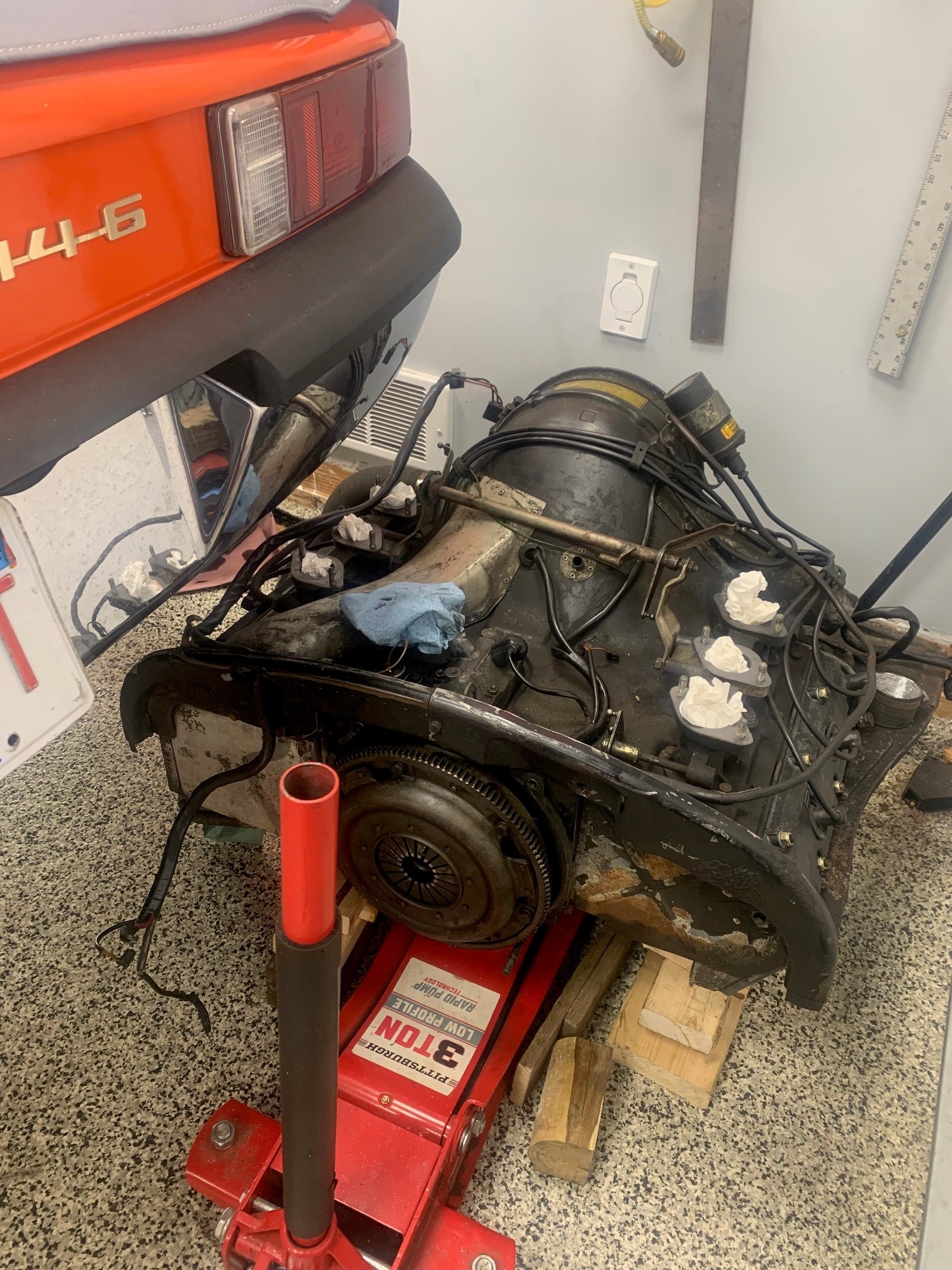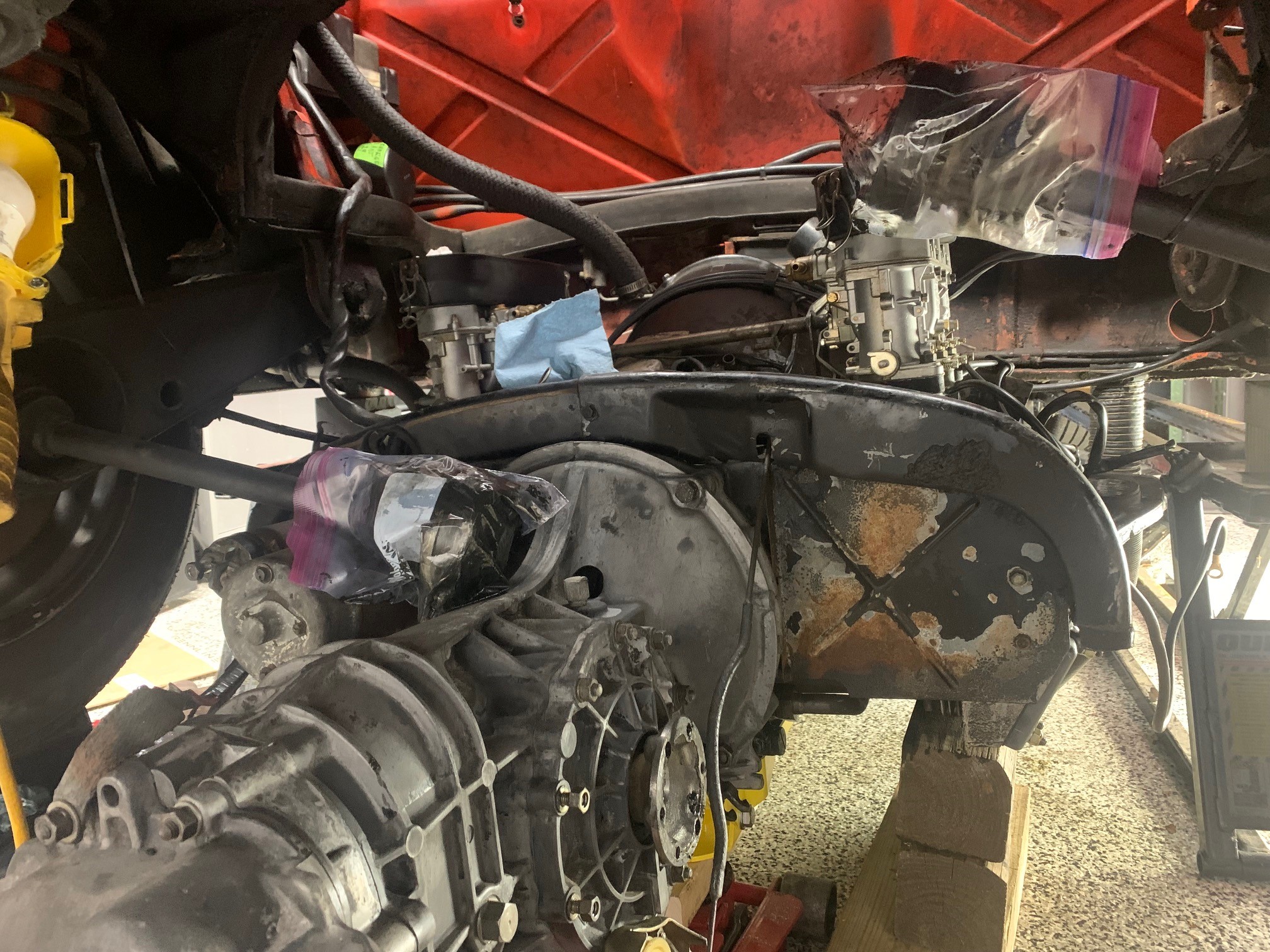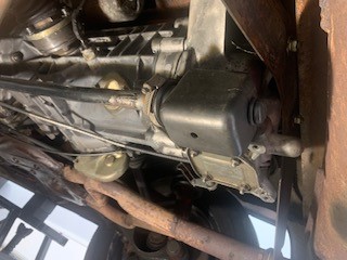 I am in the midst of removing the engine and transmission. All original. There is oil everywhere, not flowing but seeping - seems that the valve covers are not tightened or have loosened with age. Here are the first pics: