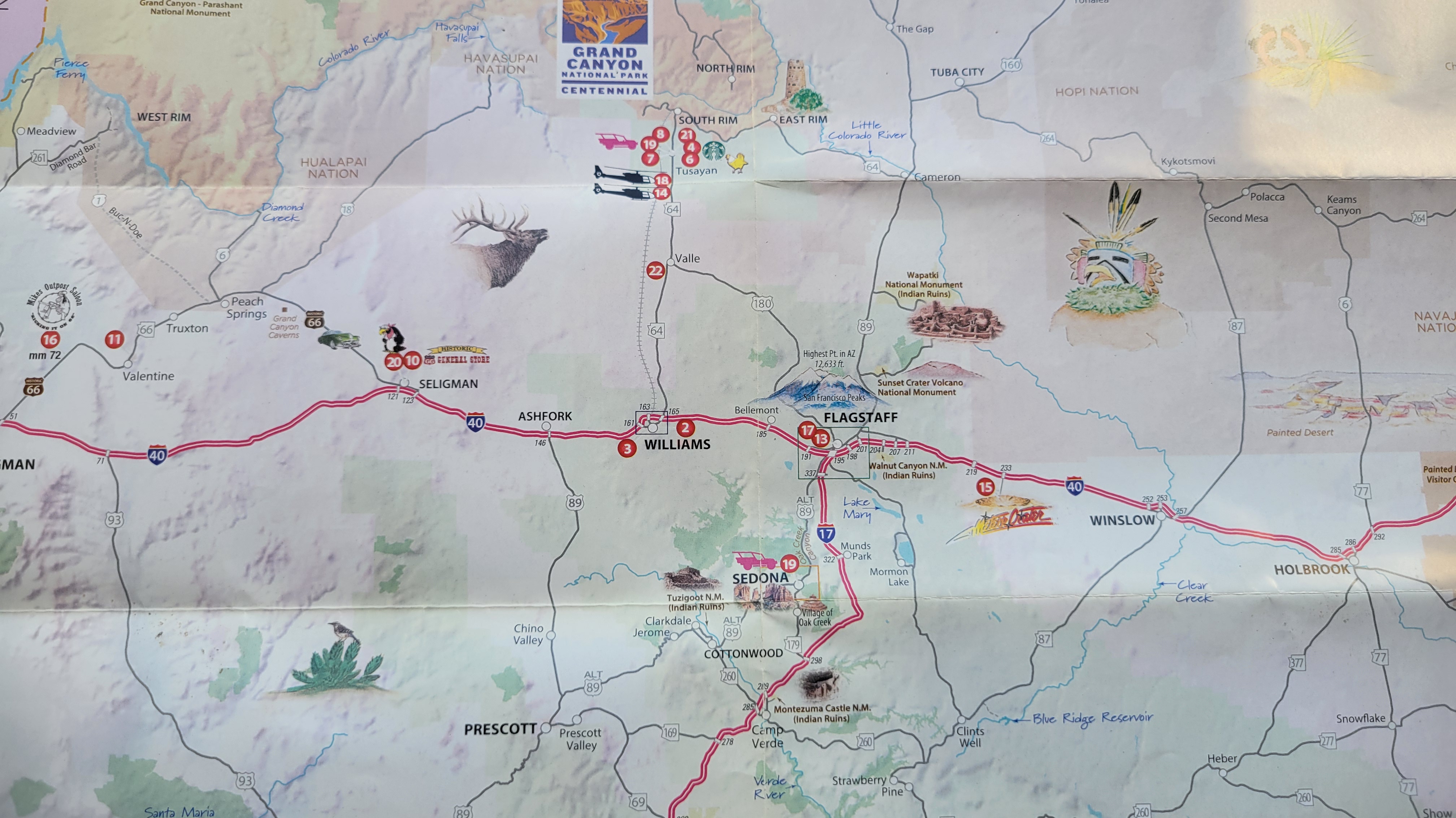 La Posada in Winslow is one night only. On Thursday we relocate (via the Grand Canyon) to the Best Western in Williams. We will stay there for three (3) nights. It will be our base of operations for all other drives and activities.