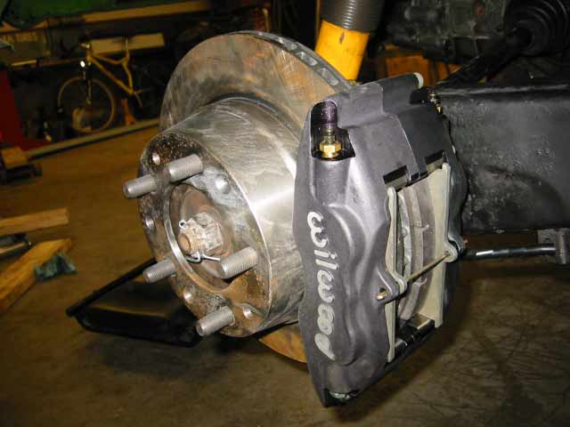 I put the Wilwoods on and ran them last weekend. Holy Cow! The car definatly stops now. I need to get used to modulating the brakes differently, but there was no indication of fade and good balance. I think the pictures explain things pretty well.....