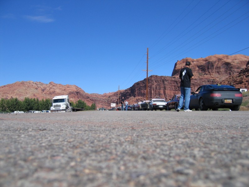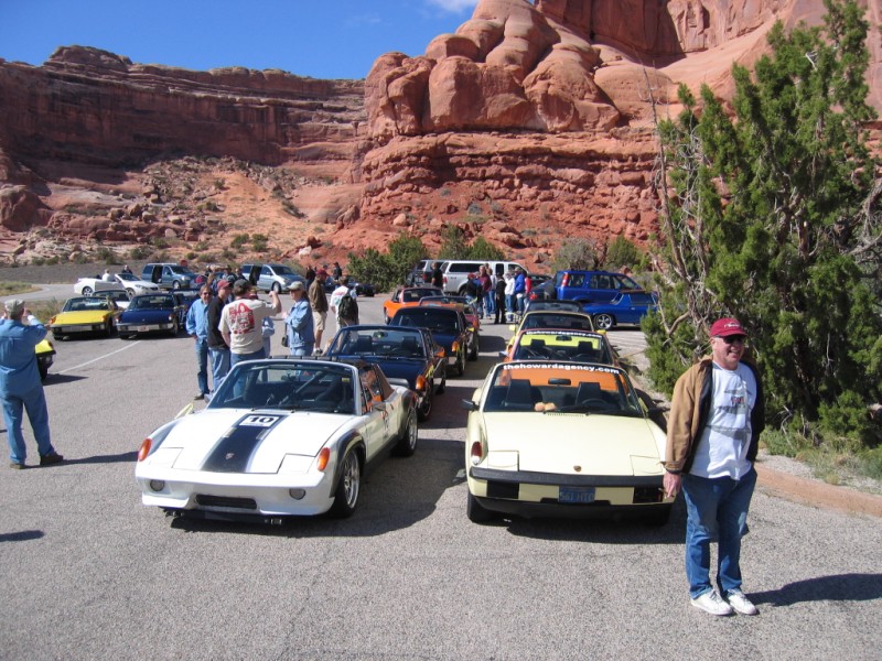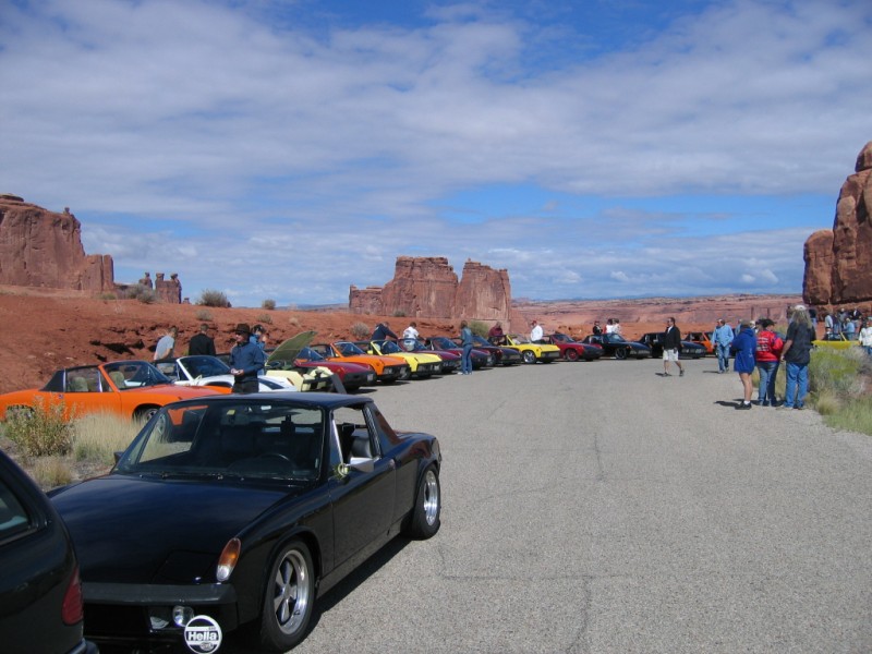 Let the celebration begin. Saturday morning and the staging for the Arches NP trip. Teeners stretch all the way to the white sign in the distance. We even had an awesome 968 from the land of enchantment join in... great car.