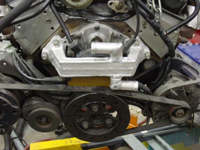 In case you don't know, an LT1 is very much like a gen I SBC. The main dinmensional differences are the intake manifold and the water pump. The intake manifold issue has been solved (flipped 180 degrees). The water pump was trickier. It sticks out of the front of the engine enough that it just won't fit.