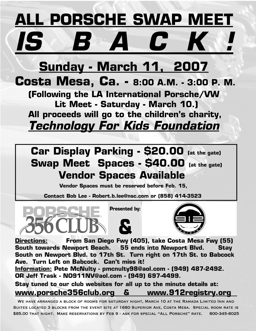 Each 10'X10' vendor space is $60.00, make a check out to the Porsche 356 Club, 727 North 4th St, El Cajon, Ca 92019. Once I receive the check I will send you an email conformation and space number. As a vendor you will be able to set up the day before between 3:00 and 6:00 PM. Also you can go to the club web site bulletin board go to ( events) for the latest info and updates.