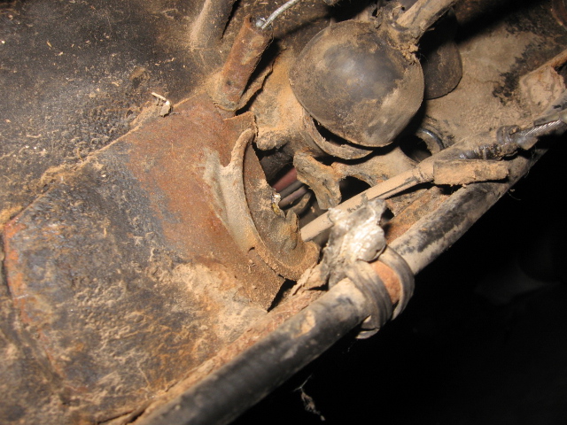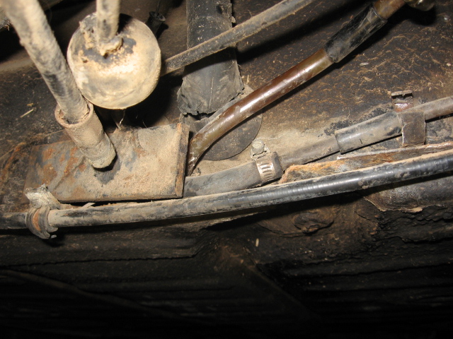 I went back out and continued to take fuel lines and the clutch cable out so I could see what the heck is going on. someone decided it was a good idea to just cut into the back end of the tunnel to patch the original fuel line with a short length of rubber hose. In the process they destroyed the area where the clutch cable comes through... very very nice... Should the clutch cable run through a metal tube in the tunnel or is it a cable with a flexible housing? are both fuel lines suppose to have their own grommets where they pop through?? Pic with fuel lines removed.