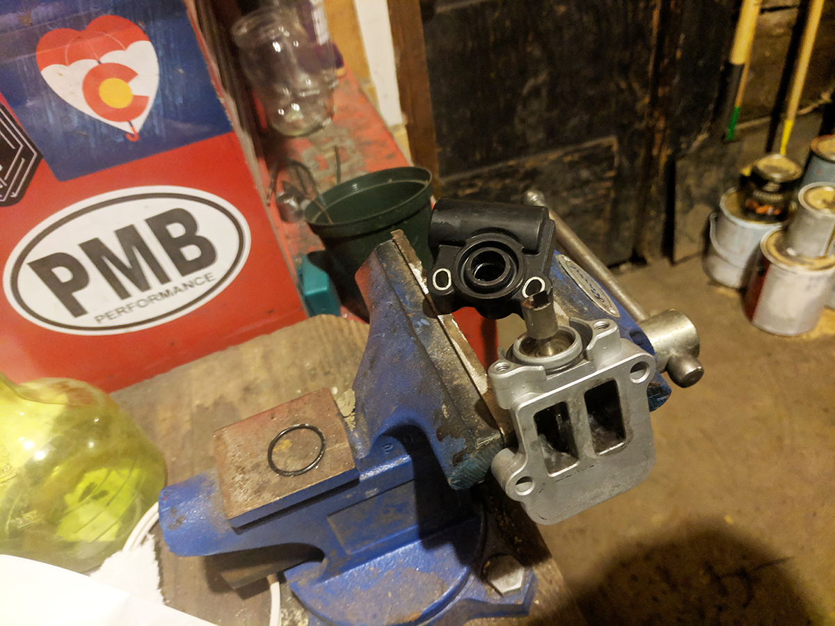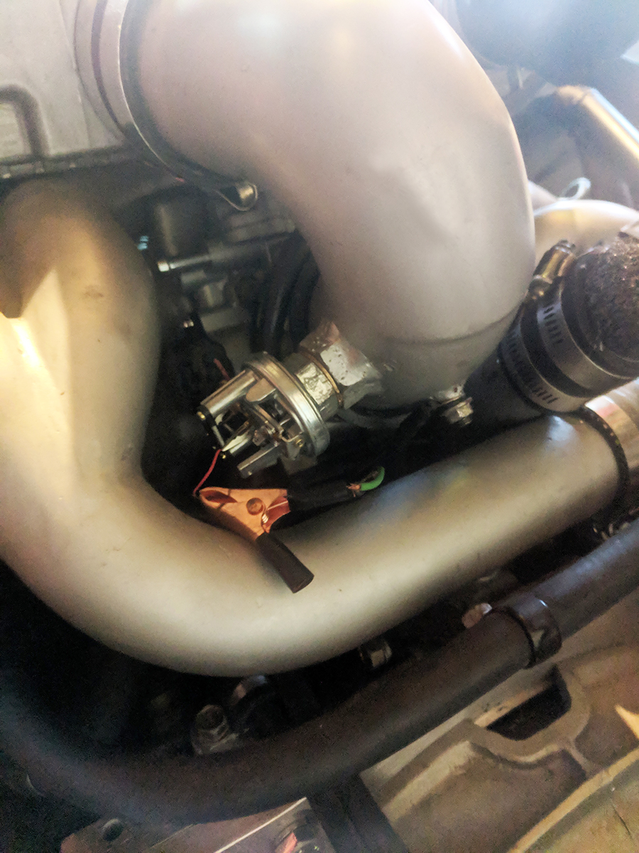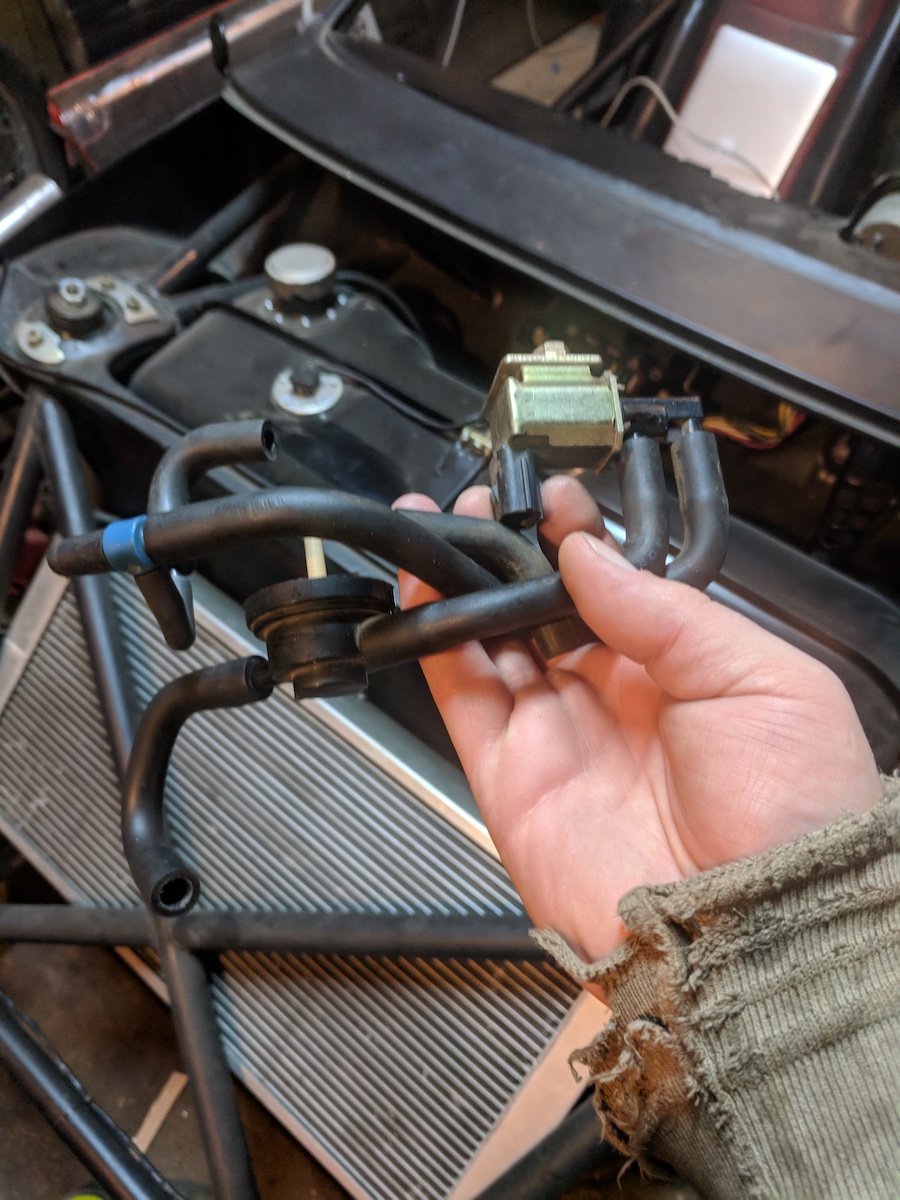 As I was plugging up my intake to pressure test it I started to ask myself what all of these vacuum hoses and controllers were in there for. Turns out these are part of the emissions system that purge the charcoal canister on the gas tank, the little doohickey is the purge valve, needless to say I don't have any canister or emissions anything so I gutted everything and capped the intake nipples, I was rewarded with the code "P0458 EVAP Emission System Purge Control Valve Circuit Low" but it doesn't throw it into limp mode so I will just add it to my list of codes to have programmed out when I get the ECU tuned. Less crap on the engine is a win for me!