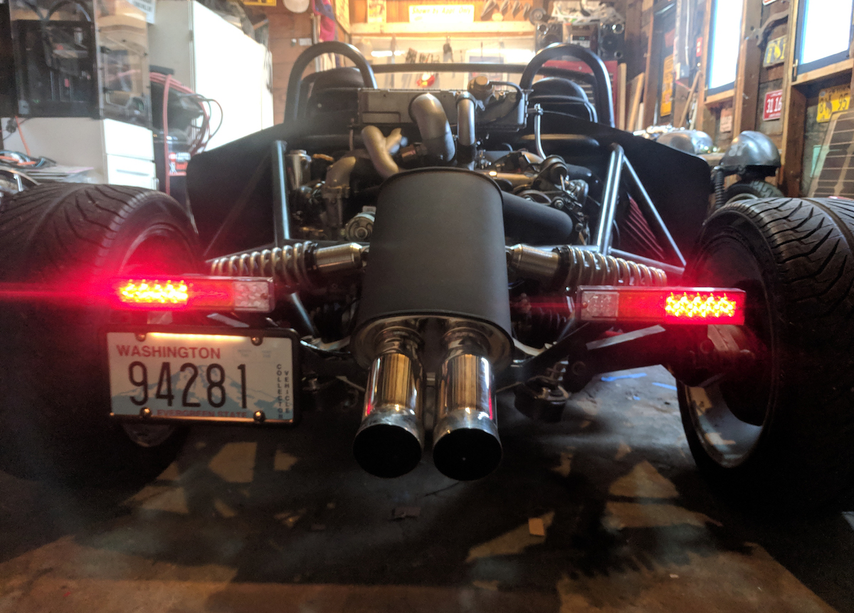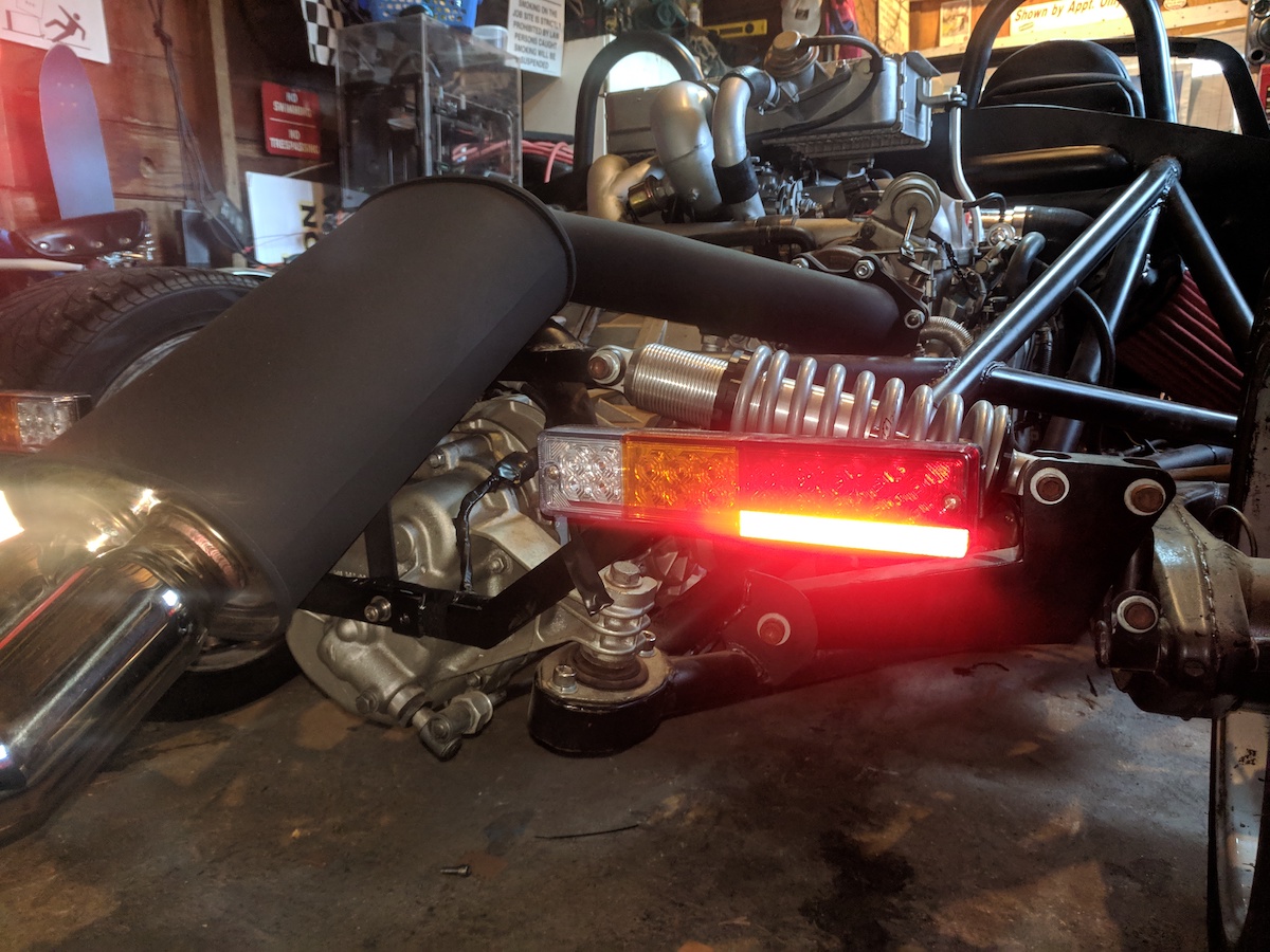 Click to view attachmentSpeaking of taillights from the earlier conversation, when I put in the muffler it eclipsed the spot I had made for the license plate, zipties weren't cutting it for Mr. Officer so I welded up a little bracket and hacked in some led lights into a license plate frame. There, that's legal too.