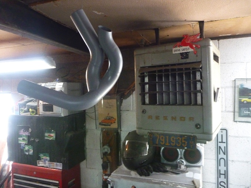 Then I sprayed the parts with high heat paint and hung them in front of my trusty Reznor heater to bake.