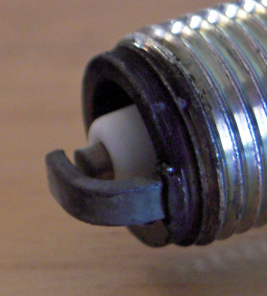 Here's a couple pics of a spark plug. The plugs I'm using are NGK BP6ES. The ground electrode (curved part) is white-ish in color, not tan.