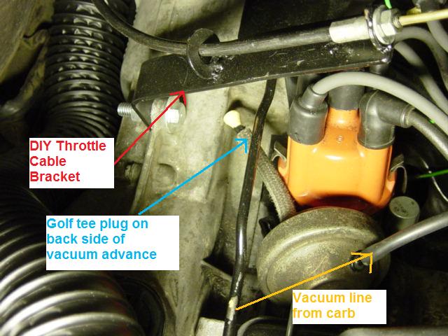Click to view attachmentNext is a pic that shows a couple of things. One thing that you'll need to do is to build a bracket for your throttle cable. (Or maybe there are some around for puchase now.) You can see the high-tech model that I created with some 1"x1/8" stock and some heavy duty washers. (It may not look like much, but it works.) Also in the photo is the line coming from vacuum port of the carb connecting to the front of the vacuum advance. My method is slightly different that what Rich described. I simply ran a line from one of the carbs to the vacuum advance. I have a T around so maybe I'll try Rich's recommendation. Finally, I have a short length of hose connected to the back nipple of the vacuum advance. I have plugged this off with a golf tee. I understand that not all dizzies have vacuum advance modules and that not all vacuum advance modules have the nipple on the back side. If yours doesn't have it, don't worry about this step. Also, if someone reads this section and