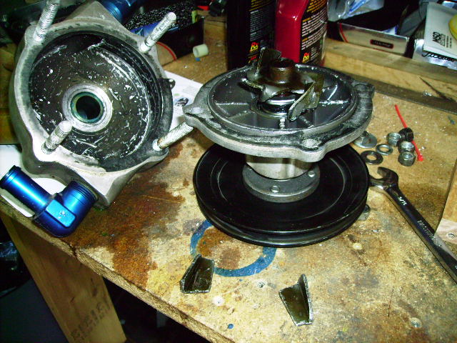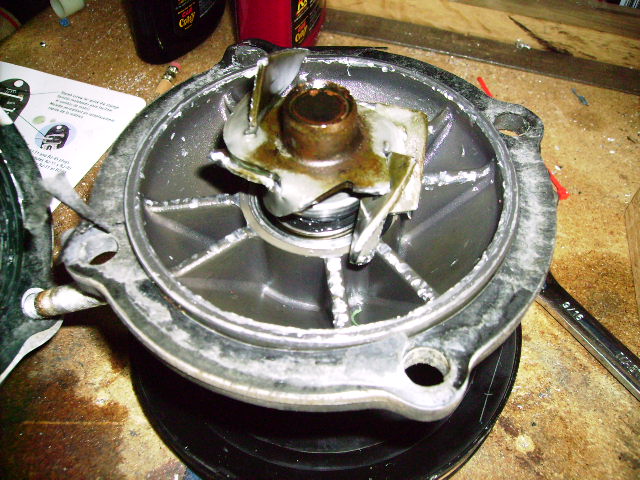 Here are pictures of the failed impeller and chewed up housing. Note the two impeller blades in the bottom of the first pict. one was jammed into the outlet pipe, hard.