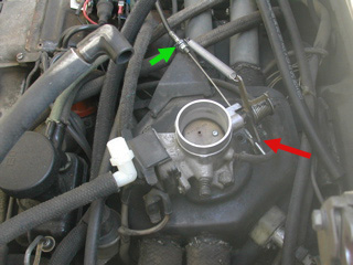 | Remove the air cleaner box and disconnect the throttle cable. The throttle cable has a locking nut (10 mm wrench) indicated with a green arrow and a barrel nut (8 mm wrench) indicated with the red arrow. Once you release the barrel nut it is very smart to pull it from the linkage and reconnect it to the cable. Barrel nuts have a nasty habit of disappearing. Finally, push the cable down through the tin. |