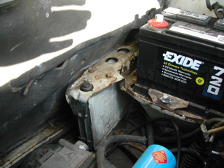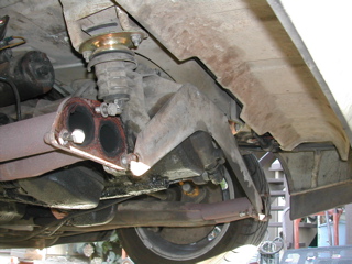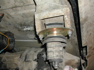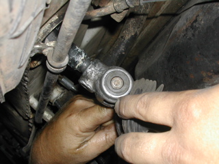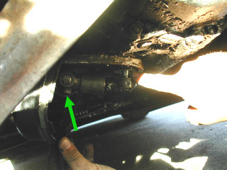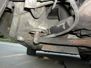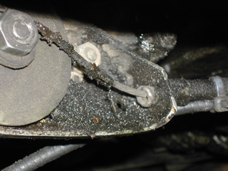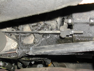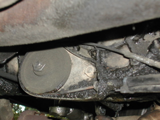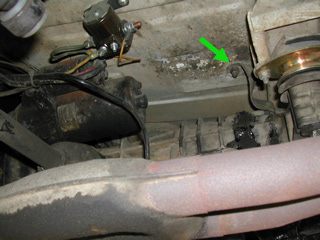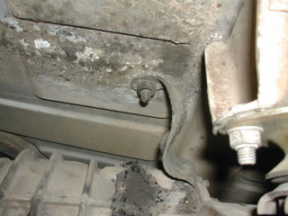 | Undo the tranny mounts (13 mm wrench). You must use a second 13 mm wrench to hold the bolt from turning. |