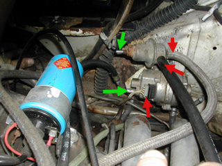 | Remove the four hoses and one electrical connection from the deceleration valve (top) and the MPS (bottom). The two green arrows indicate hoses that have already been removed in this picture. The other end of the black hose (in this picture) connects to the air box and has therefor already been disconnected. It can, optionally, be left connected. |