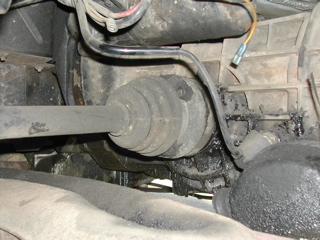 | Pull the two wires from the reverse light switch on the transmission. They are covered by a boot and pull straight out. Disconnect the CV joints from the stub axles. It takes a special 12 mm serrated socket but careful use of an appropriately sized allen wrench can do the job. You may need to raise one side of the car a bit to turn the wheel and access all four bolts. I often don't need to when loosening. The serrated socket is one you'll use more than once over the life of your car. It's recommended you get this right tool to do the job. (Am I making my point clear enough?) The CVs can be difficult to remove from the stub axles. Careful application of hammer and screwdriver can coax it free. |