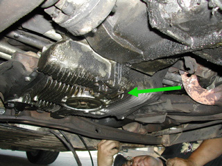 | Time to get the floor jack out. This is the spot you should aim for to get the engine and tranny in decent balance. You can use a block of wood to protect the engine case, but it often makes the assembly too tall to sneak out from under the car. I don't use wood. Once the jack is lifted enough that it raises the car an inch or so you're ready for the final step. |